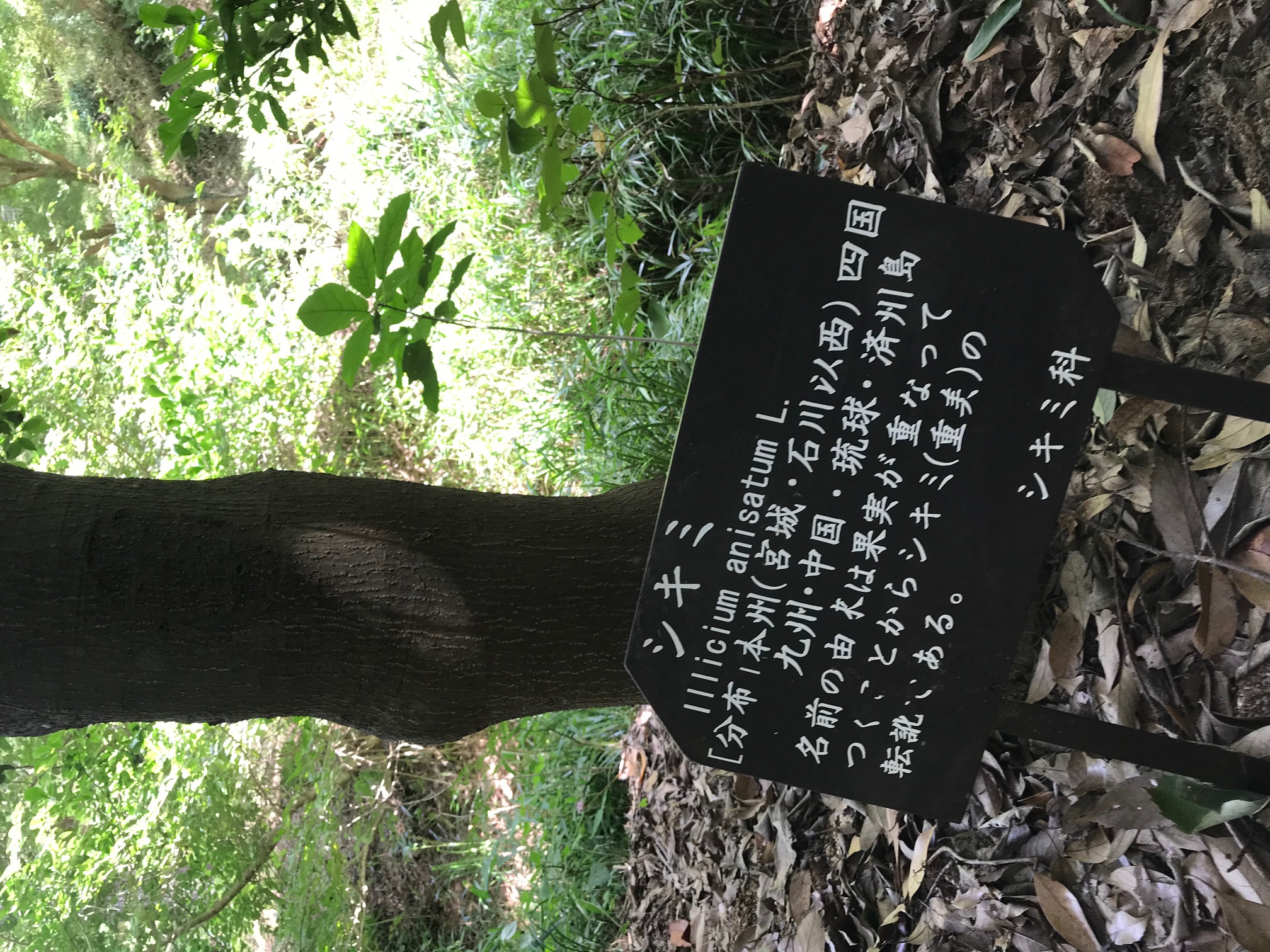 シキミ(Illicium anisatum)は、常緑の小高木で、高さは2〜5メートルに成長します。葉は革質で光沢があり、長さは6〜12センチメートル程度です。緑色をした花は春から初夏にかけて開花し、星形の実を結びます。この実や種子には毒性があり、摂取すると中毒症状を引き起こすことがあります。