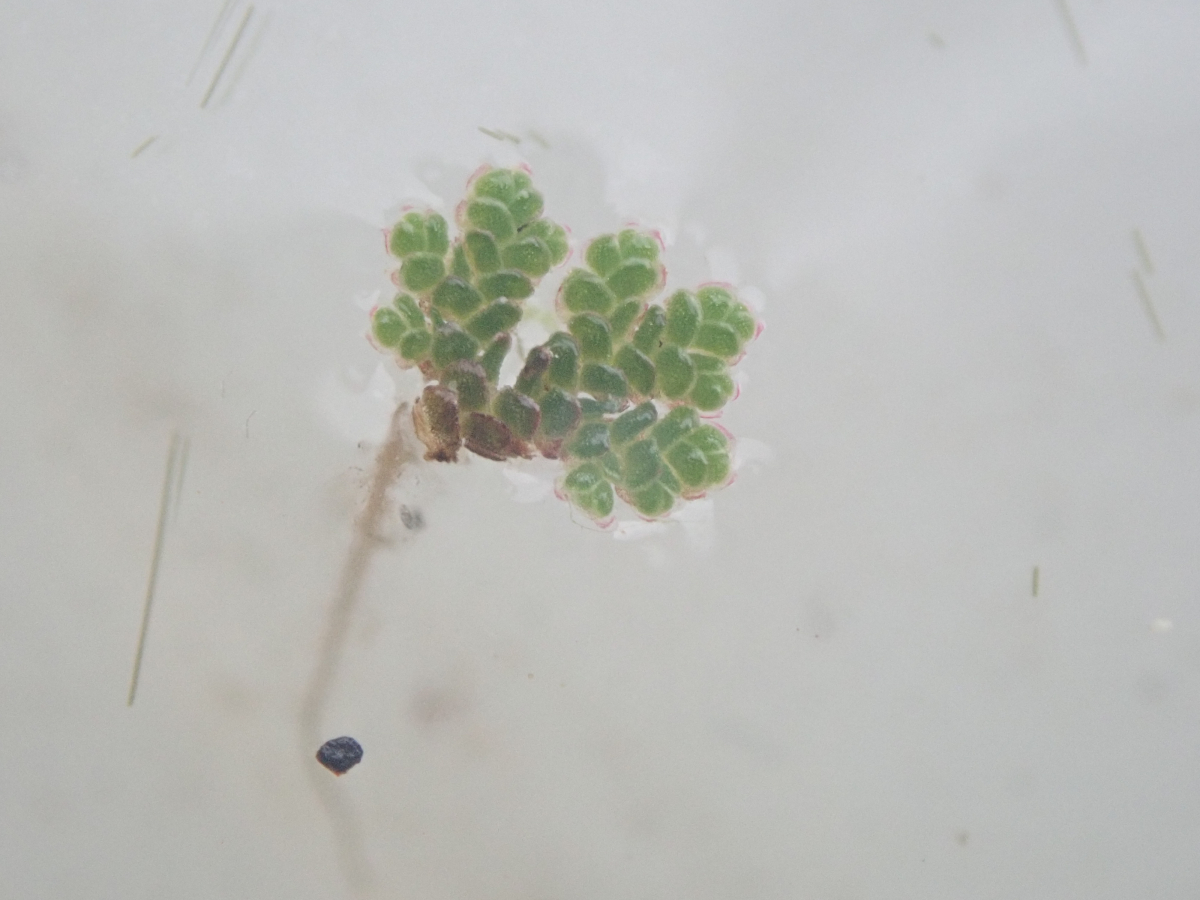 アカウキクサは、全体の形が三角形。オオアカウキクサの仲間は扇型に成長する。在来種のオオアカウキクサは湧水のある場所に生育する絶滅危惧種。