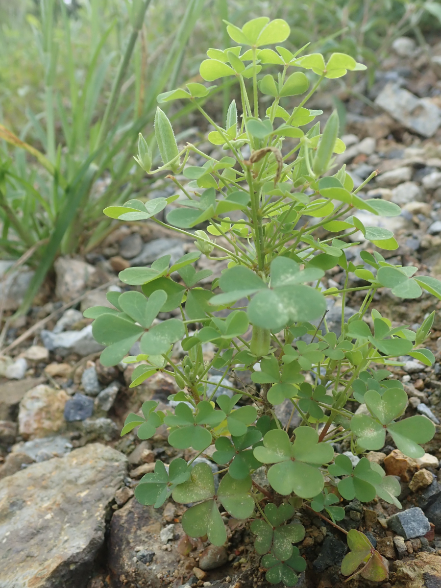 鮮やかな黄色の五弁花をつけ、葉や花はカタバミに似ているが茎が立ち上がるのが特徴。