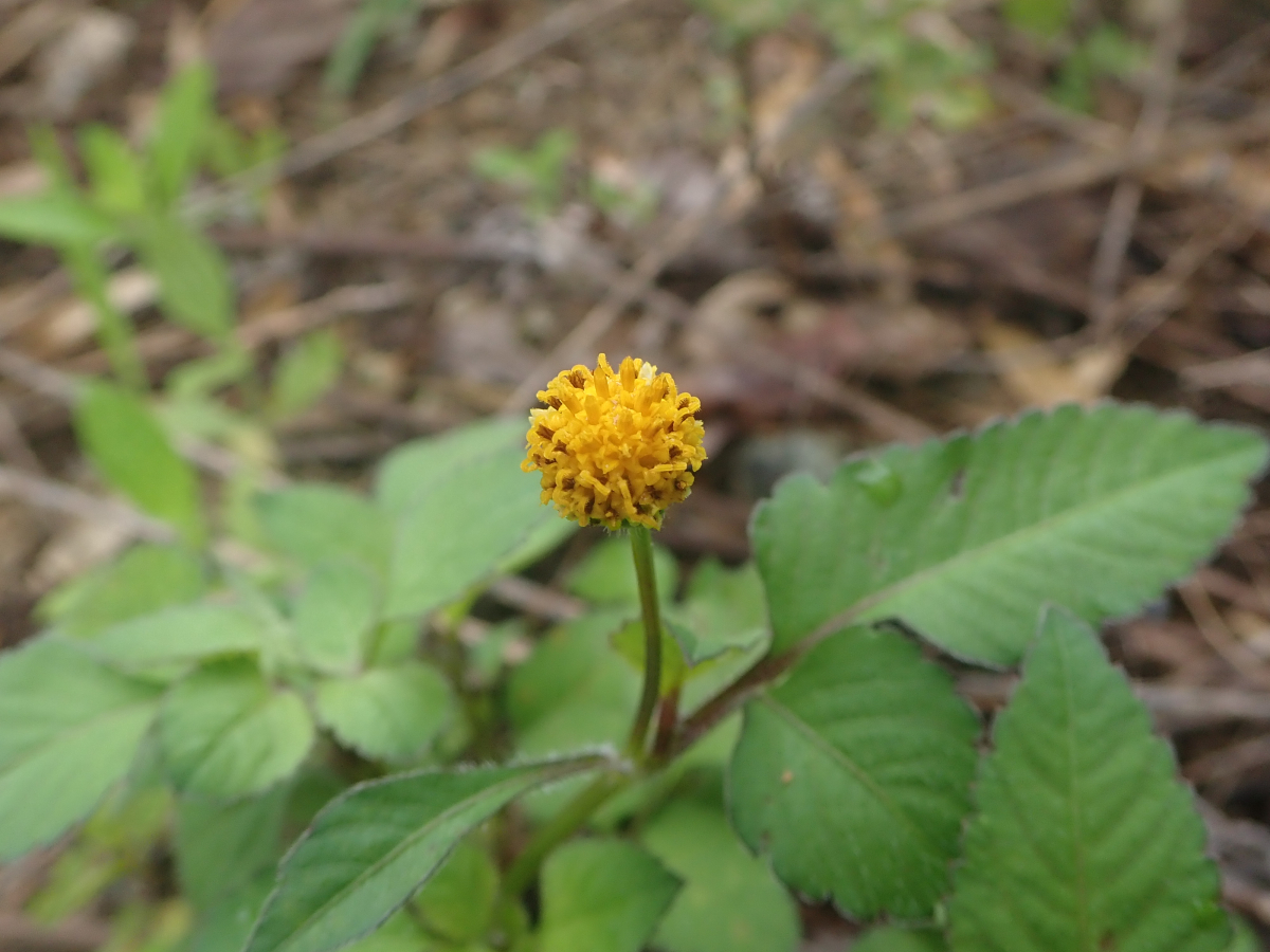 黄色の頭花は筒状花だけで舌状花はなく、総苞片は短い。