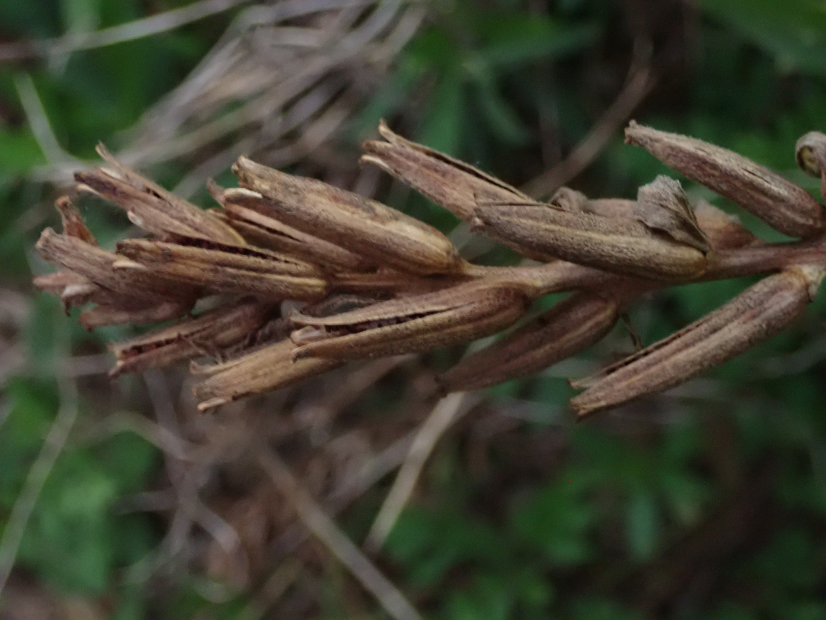 花が咲いた後、茎の上部にたくさんの円柱状の果実をタワーのように着ける。