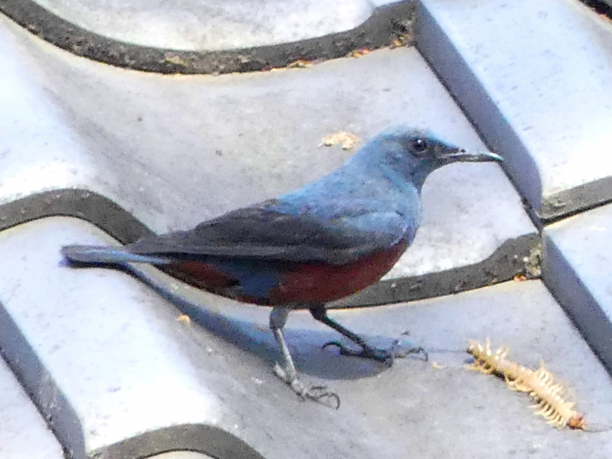 オス 弓道場の屋根でムカデを食べていました。