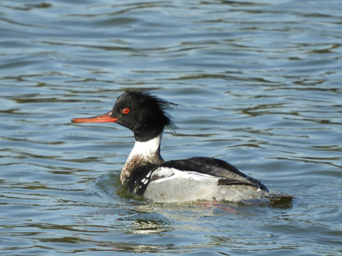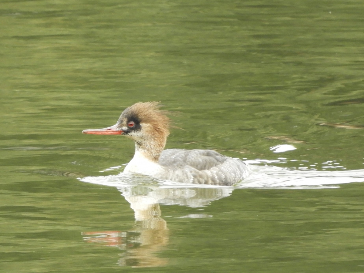 - 鋭い赤色のくちばしが目立ち、これがウミアイサの識別ポイントになる。