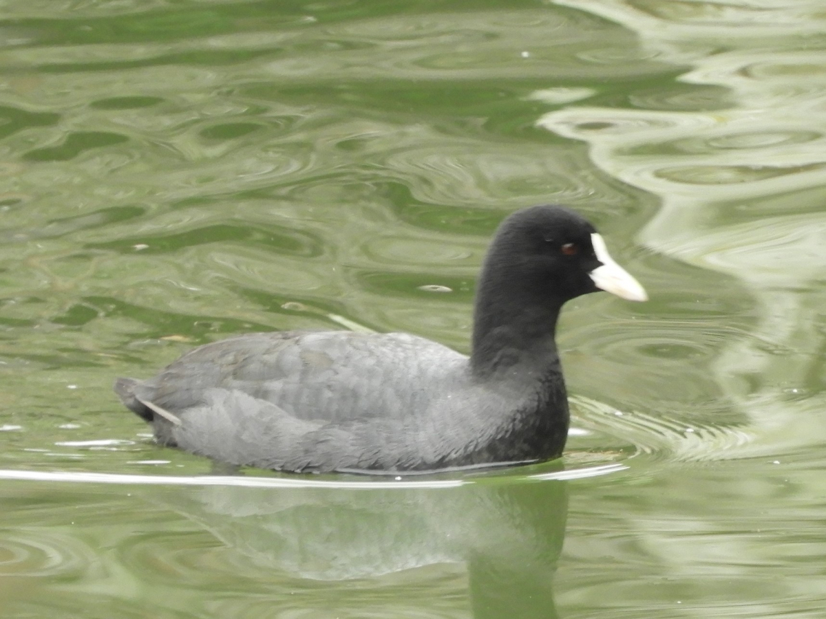 - カイツブリと間違えやすいが、オオバンはより大型で、くちばしが白いのが決定的な違いです。