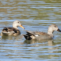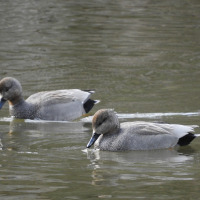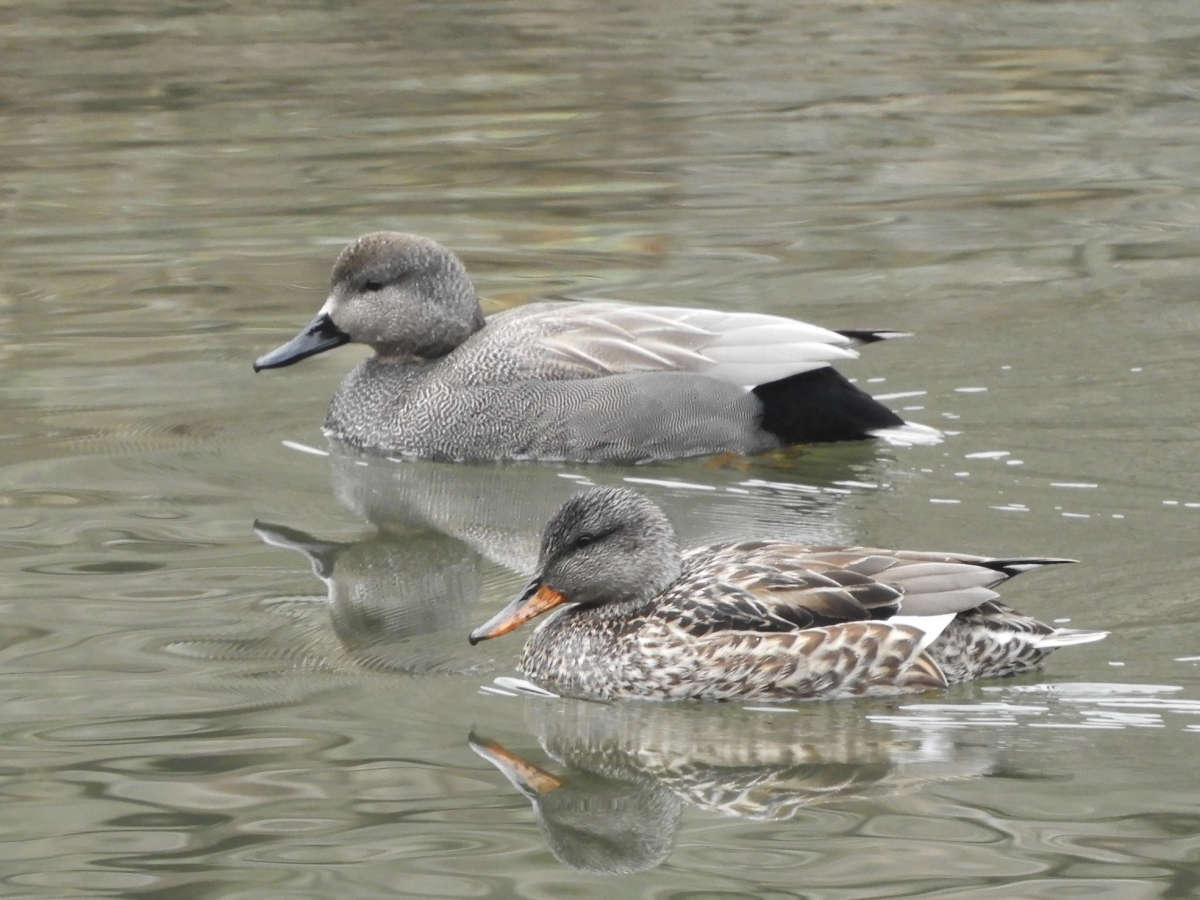 オカヨシガモのオスは、頭部が灰褐色で、胸から腹部にかけては灰色の小さな波模様があります。翼鏡は白く見え、尾は黒色。メスは全体的に茶褐色で、地味な印象です。