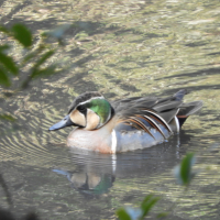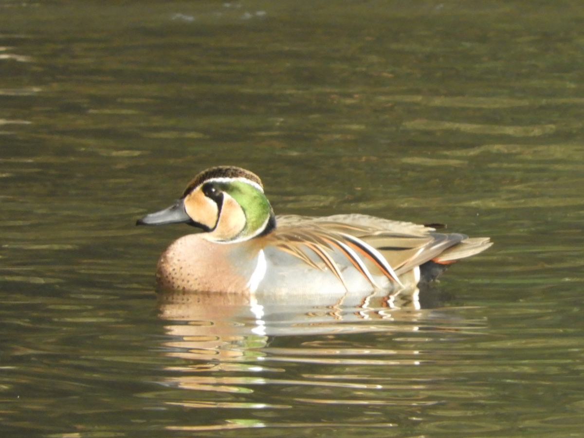 - オスは頭部の三日月形の白い模様が特徴で、これが他のカモ類との大きな識別点である。コガモやオカヨシガモなどの類似種と区別できる。