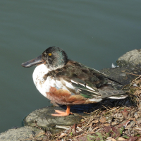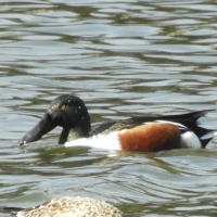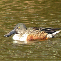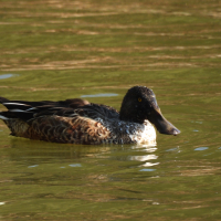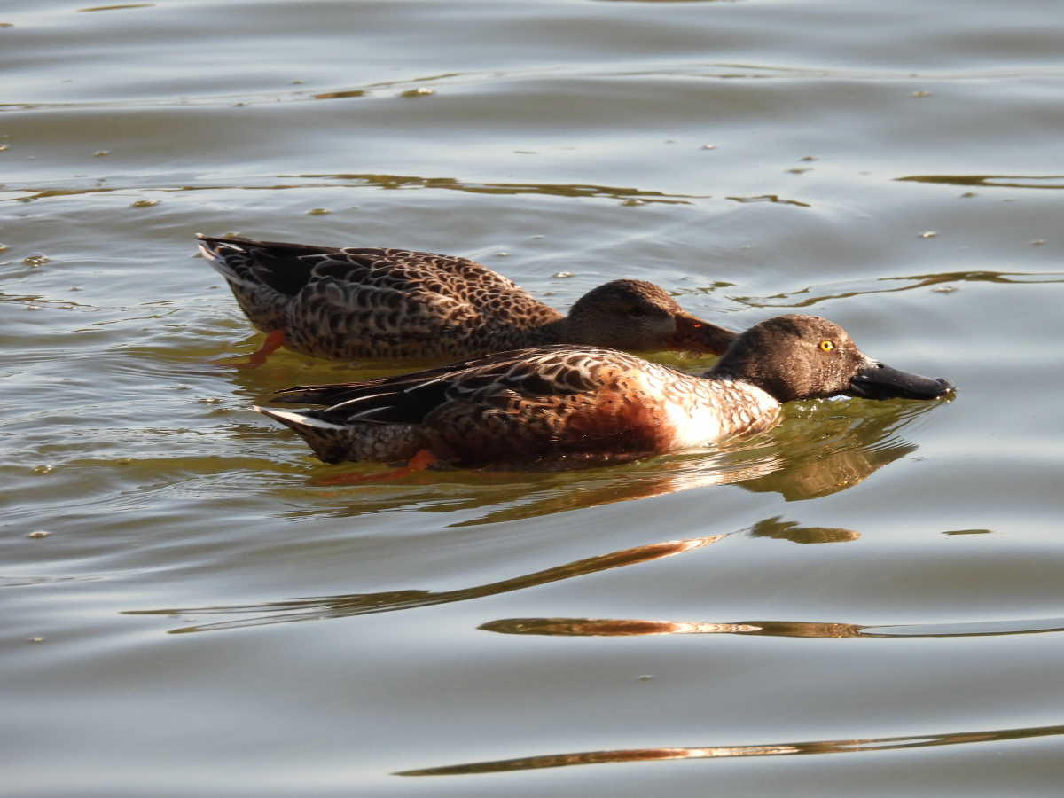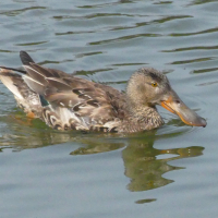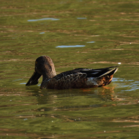 - メスは褐色の体色と幅広いくちばしで、カイツブリとコガモと区別可能。