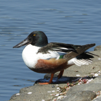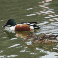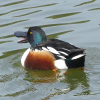 ハシビロガモは全長約50cmから60cmの大型のカモである。特にオスは全羽で頭が青緑色であり、目立つ特徴を持つ。