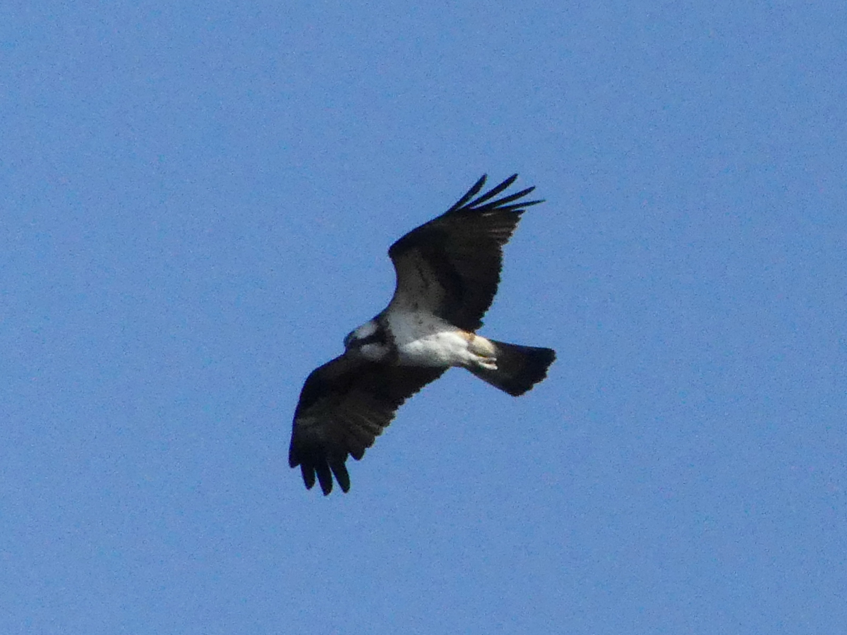 - ミサゴはトビと比較すると、下半身が白色であり、飛翔時に翼の縁が黒いのが特徴的である。