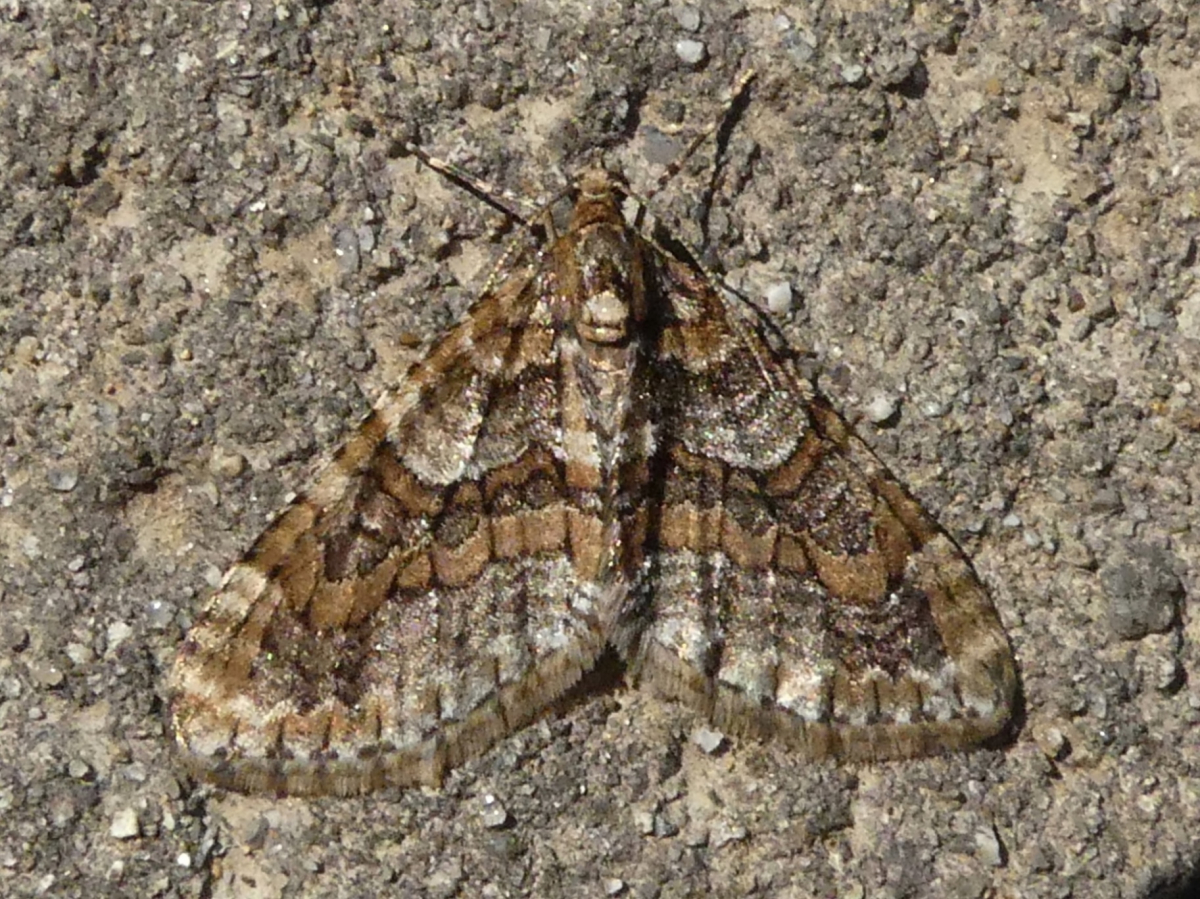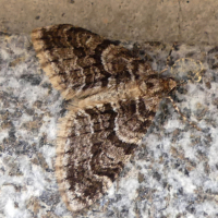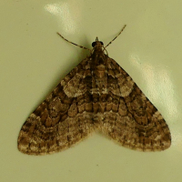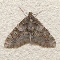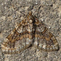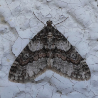 春にだけ現れるナミシャク亜科の蛾。 翅は灰白色の地色に、数本の線や帯による繊細な模様がある。模様の色には個体差がある。