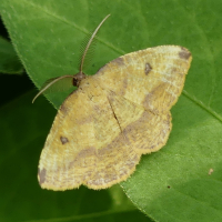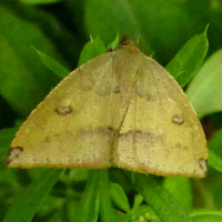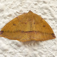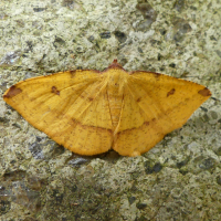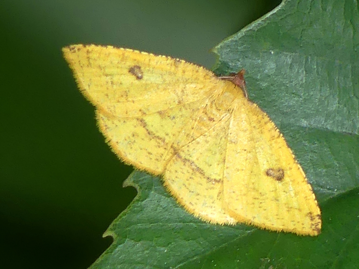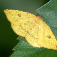 エダシャク亜科の仲間。 前翅・後翅ともに黄色で、外縁に紅色がかかる。 前翅に1対の小さな紋がある。