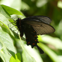 全体に黒っぽいが、構造色により緑色~青色に輝く美しいアゲハチョウ。