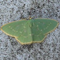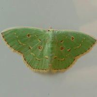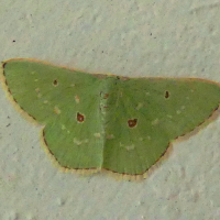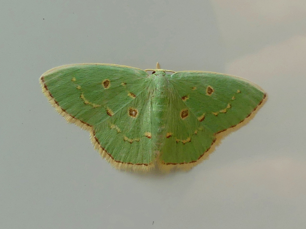 うすい緑~青緑色で、前翅、後翅それぞれに丸い小さな紋が1つずつある。