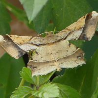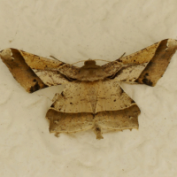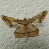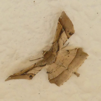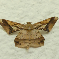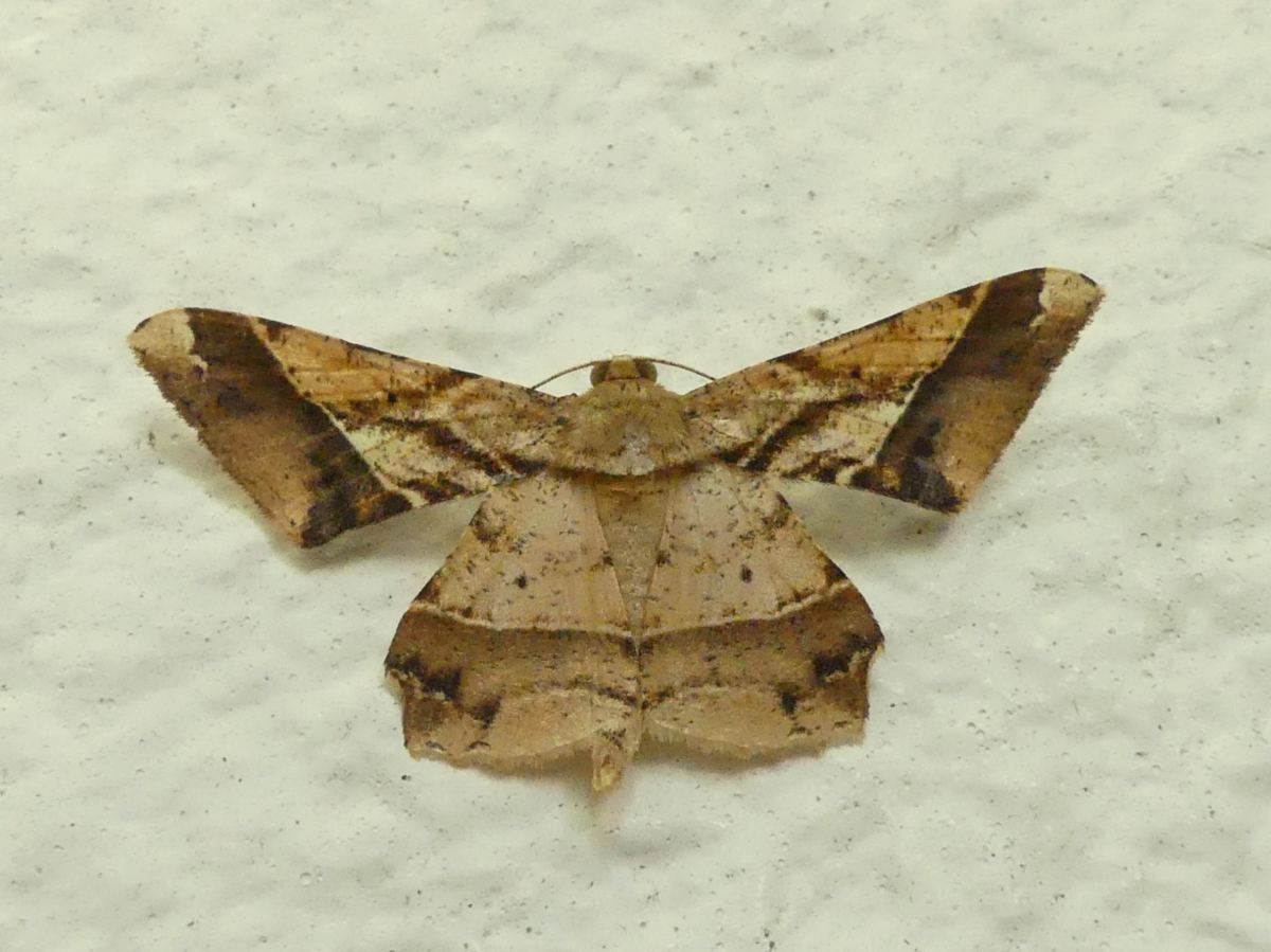直線で切り取られたような翅をもつ蛾。淡褐色で紋様も直線的。色の変異は激しい。