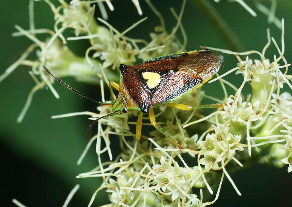 カメムシ目 カメムシ亜目 ツノカメムシ科 ツノカメムシ亜科 撮影地:西宮市 背中にハート型の黄色い紋をもつカメムシです。 名前にある「エサキ」は、昆虫学者の江崎悌三(えさきていぞう)のことです。