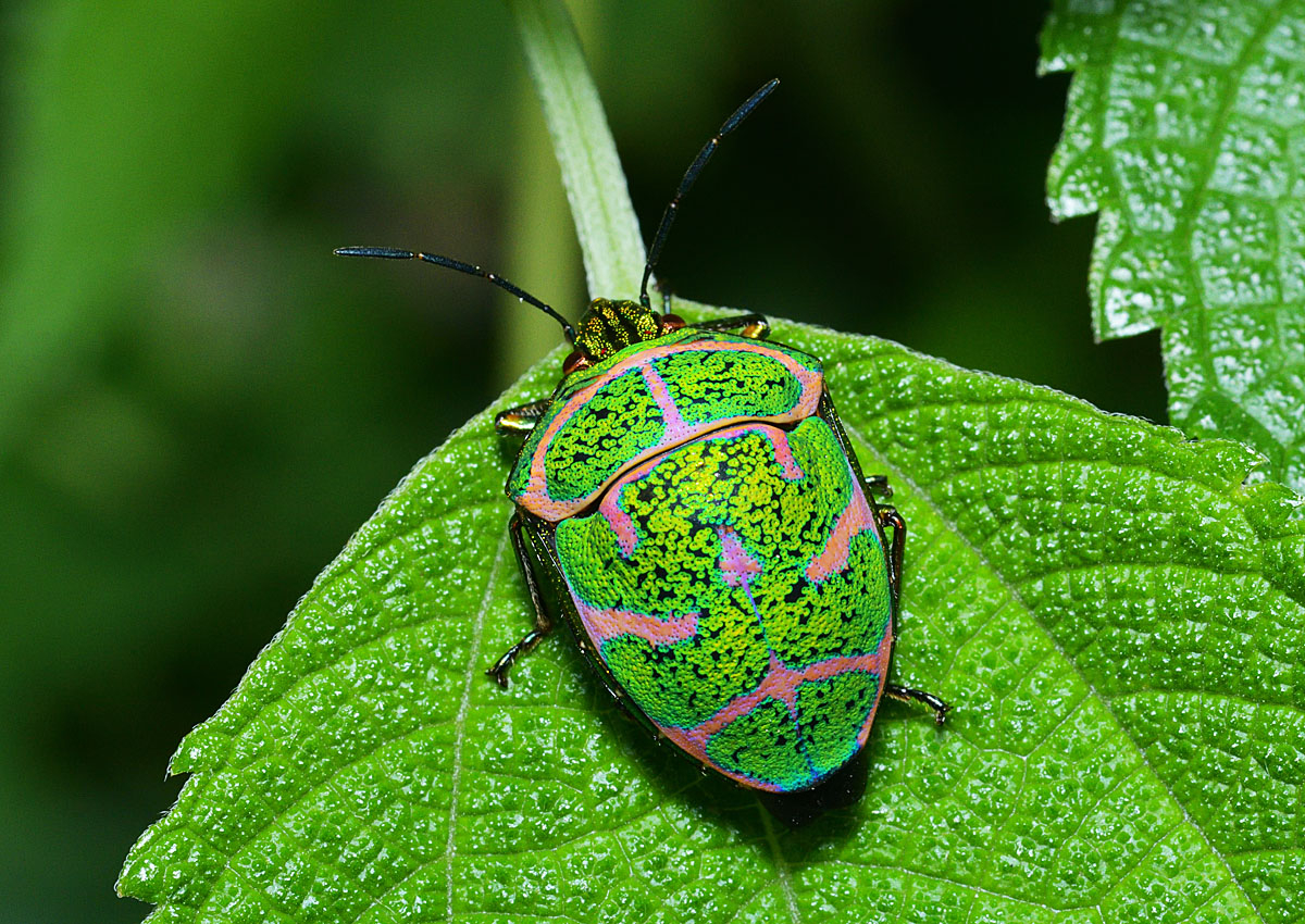 カメムシ目 カメムシ亜目 キンカメムシ科 キンカメムシ亜科 撮影地:西宮市北東部 赤い線がややピンク色なので、羽化して間もない個体と思われる。