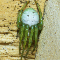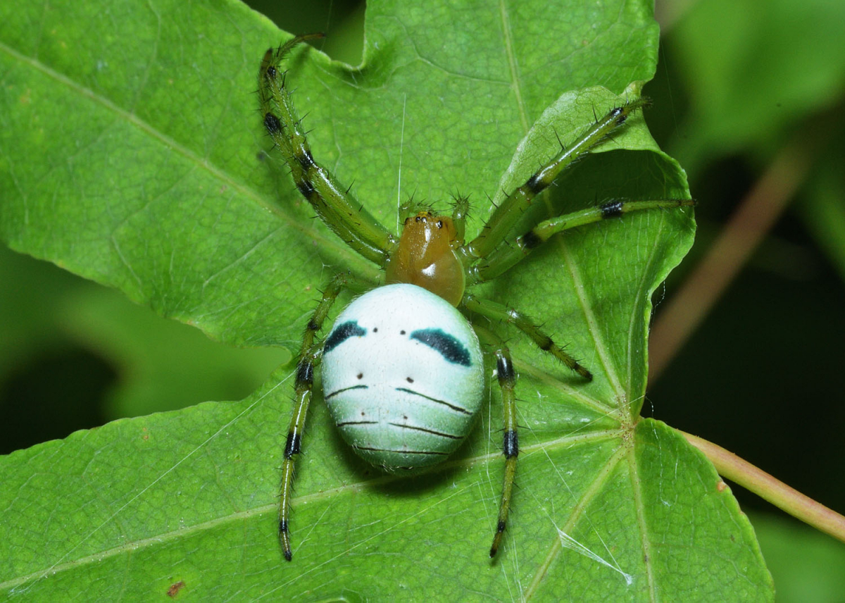 歩脚と腹部の腹面は緑色で腹部背面は青みを帯びた白色。