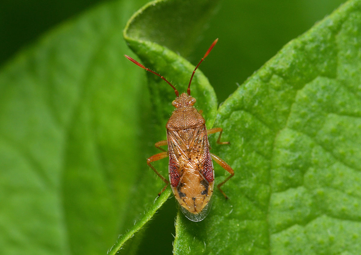 茶色の小さなカメムシ。 触角、肢の腿節部、前翅の一部などが赤色。 触角、肢、体表は少し毛深い。
