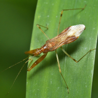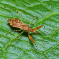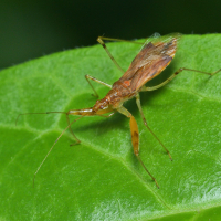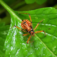 小型のサシガメ。 体色は赤色で、前肢はカマキリの鎌のようになっている。 中肢と後肢の腿節の先端付近に褐色の輪紋がある。