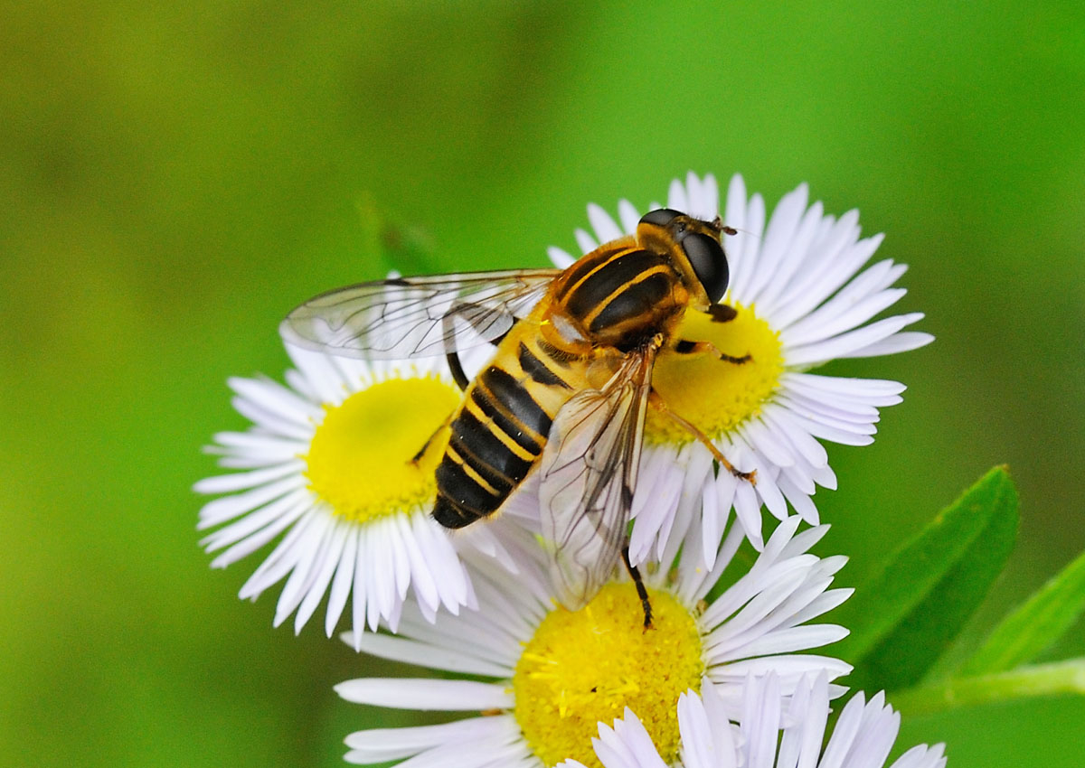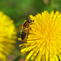 成虫が花に集まるハナアブ科ハナアブ亜科の仲間。