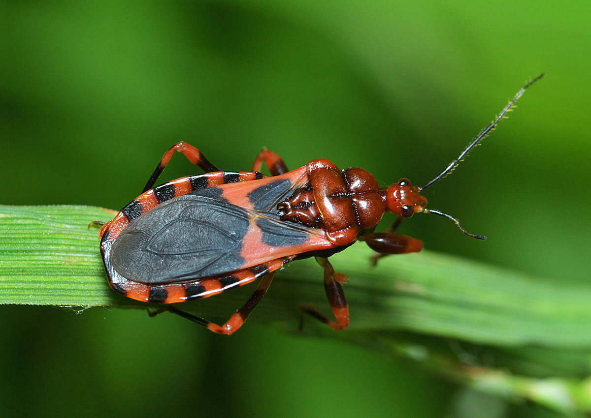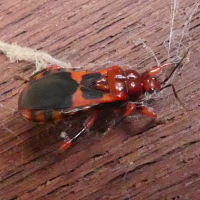 ビロウドサシガメ亜科アカシマサシガメ属に属するサシガメ。 黒い体色に赤い紋様がきれい。 同属のクビグロアカサシガメやアカシマサシガメに似るが、本種の特徴は頭部・前胸部が赤色、肢が赤色の地に黒色の斑模様である。