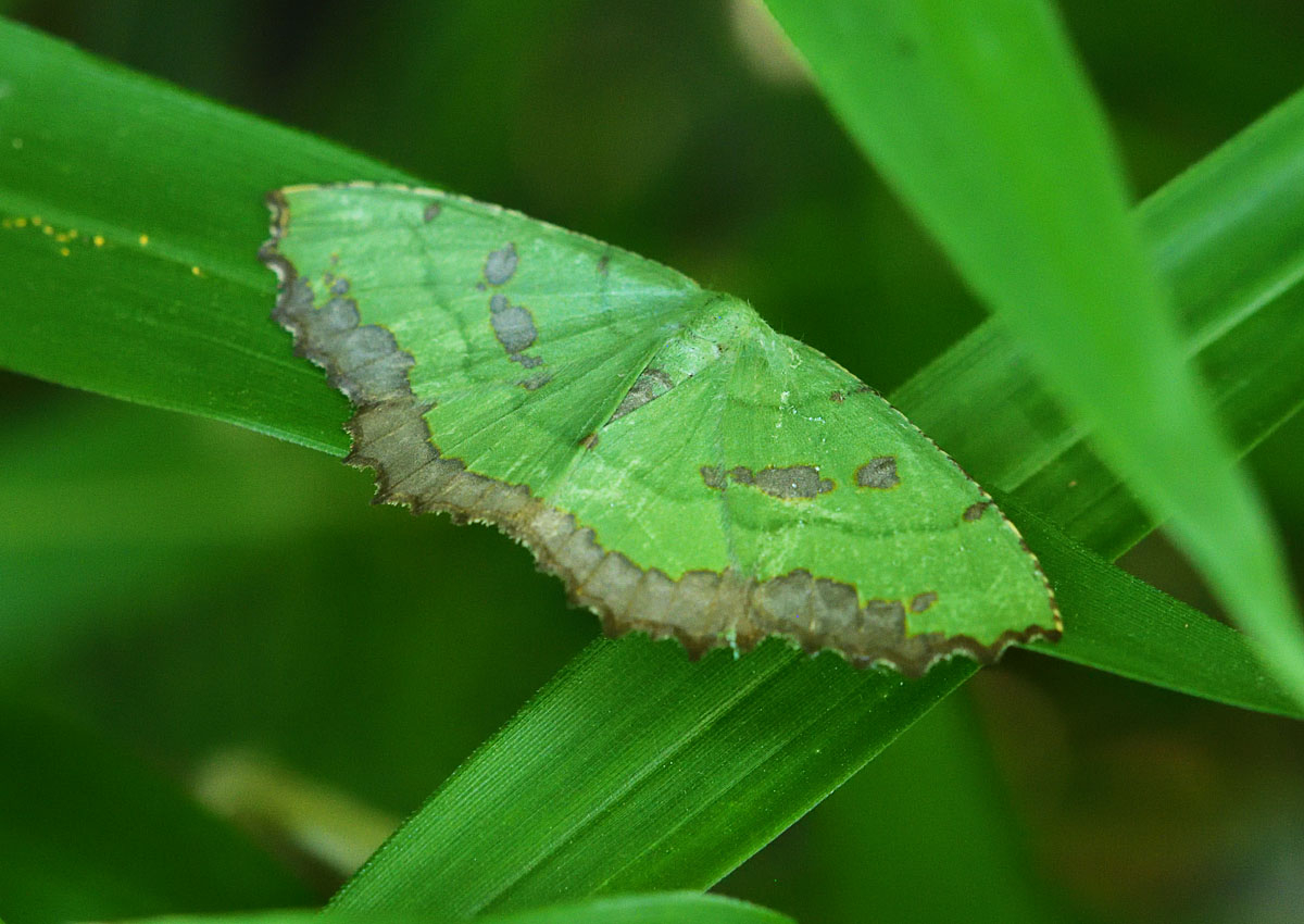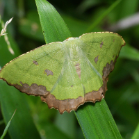 シャクガ科 アオシャク亜科の仲間。 緑色で、翅の外縁部は茶褐色の帯があり、中央部にも茶褐色の紋があるシャクガ。緑色は、鮮やかなものからくすんだもの、さらにはほとんど灰色のものまで変異がある。 梅雨の時期に現れる。