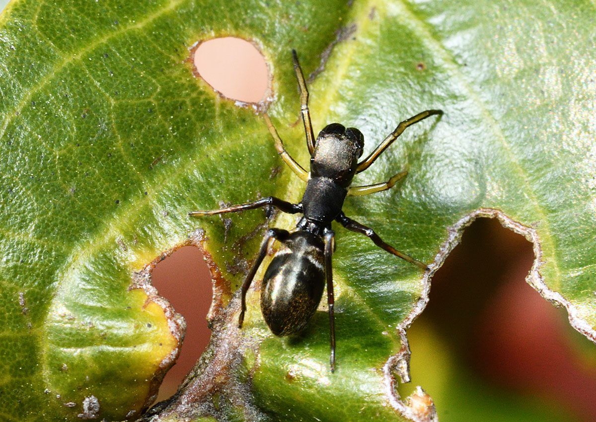 アリにそっくりのハエトリグモ。オスは大きな上顎をもつ。 第1肢を上に上げて触角に似せる動きをする。 広葉樹の葉の上を徘徊していることが多く、ふだんの動きはアリそのもの。 アリに擬態しているのは、クモの天敵から逃れるためと考えられている。