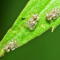 翅が半透明で褐色の斑模様があるグンバイムシの仲間。 北アメリカ原産、日本への侵入は1999年に西宮市で確認されたのが最初。