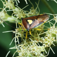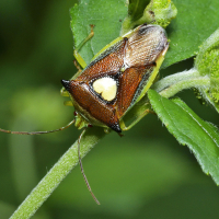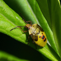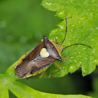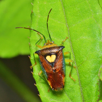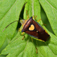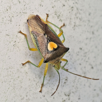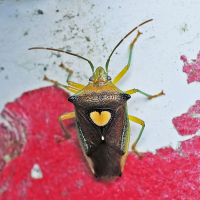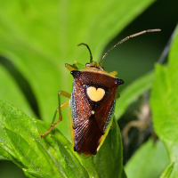 体の周縁部が緑色、中央部が褐色、小楯板に黄色のハート型の紋があるカメムシ。