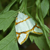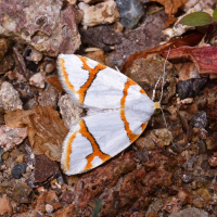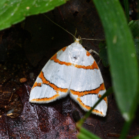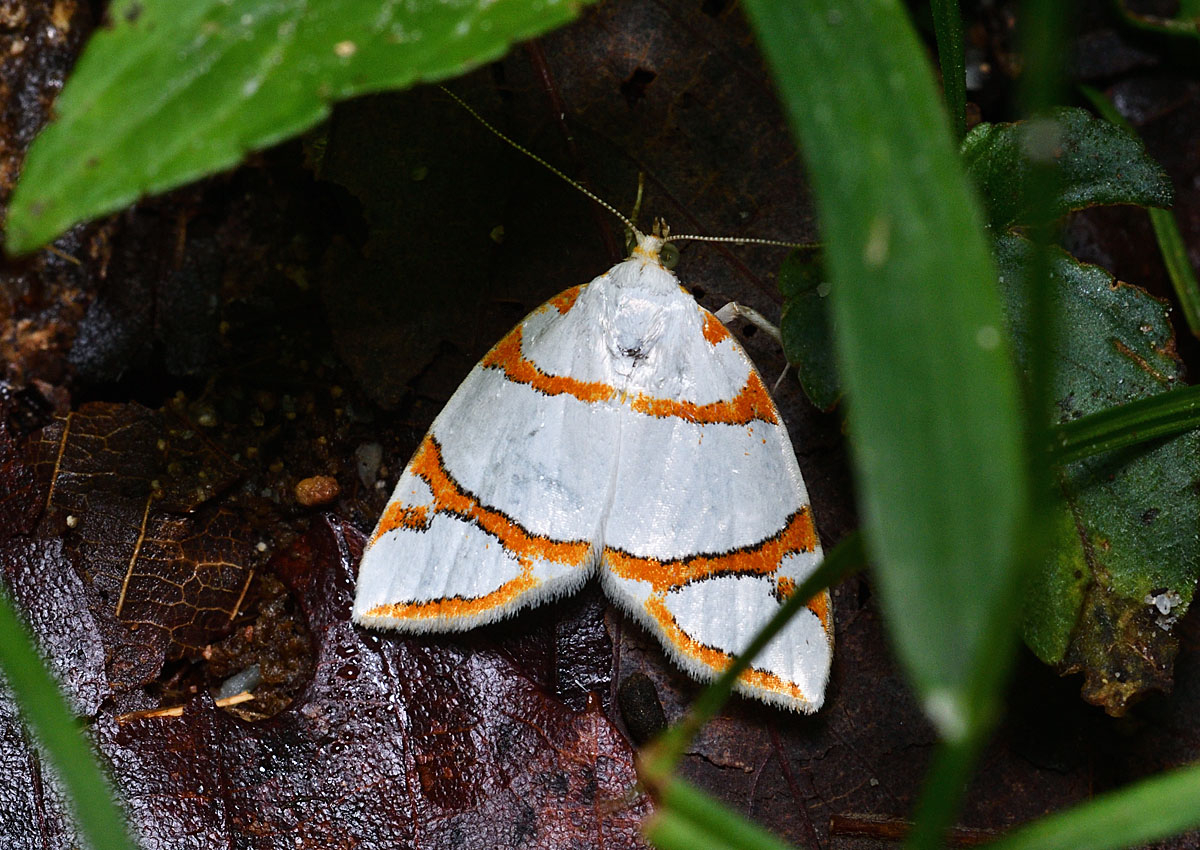 白色で、前翅に朱色の帯が独特の模様をつくる、きれいな蛾。 林の中で見ることが多い。
