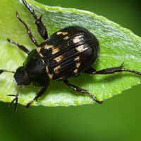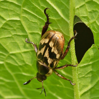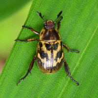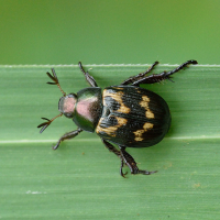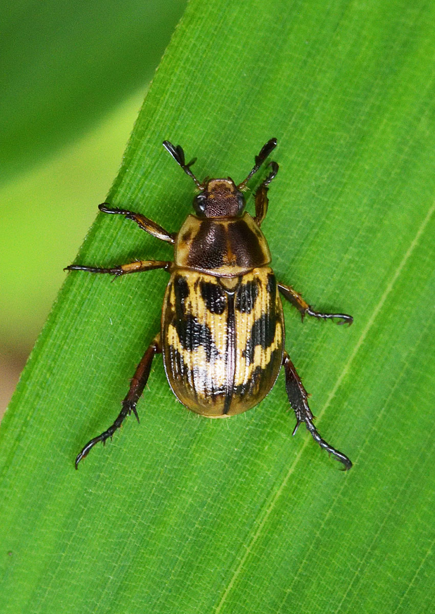 淡い褐色と黒色が斑模様を成すコガネムシ。体色の変異が激しく、全身黒色のものもいる。