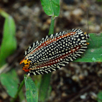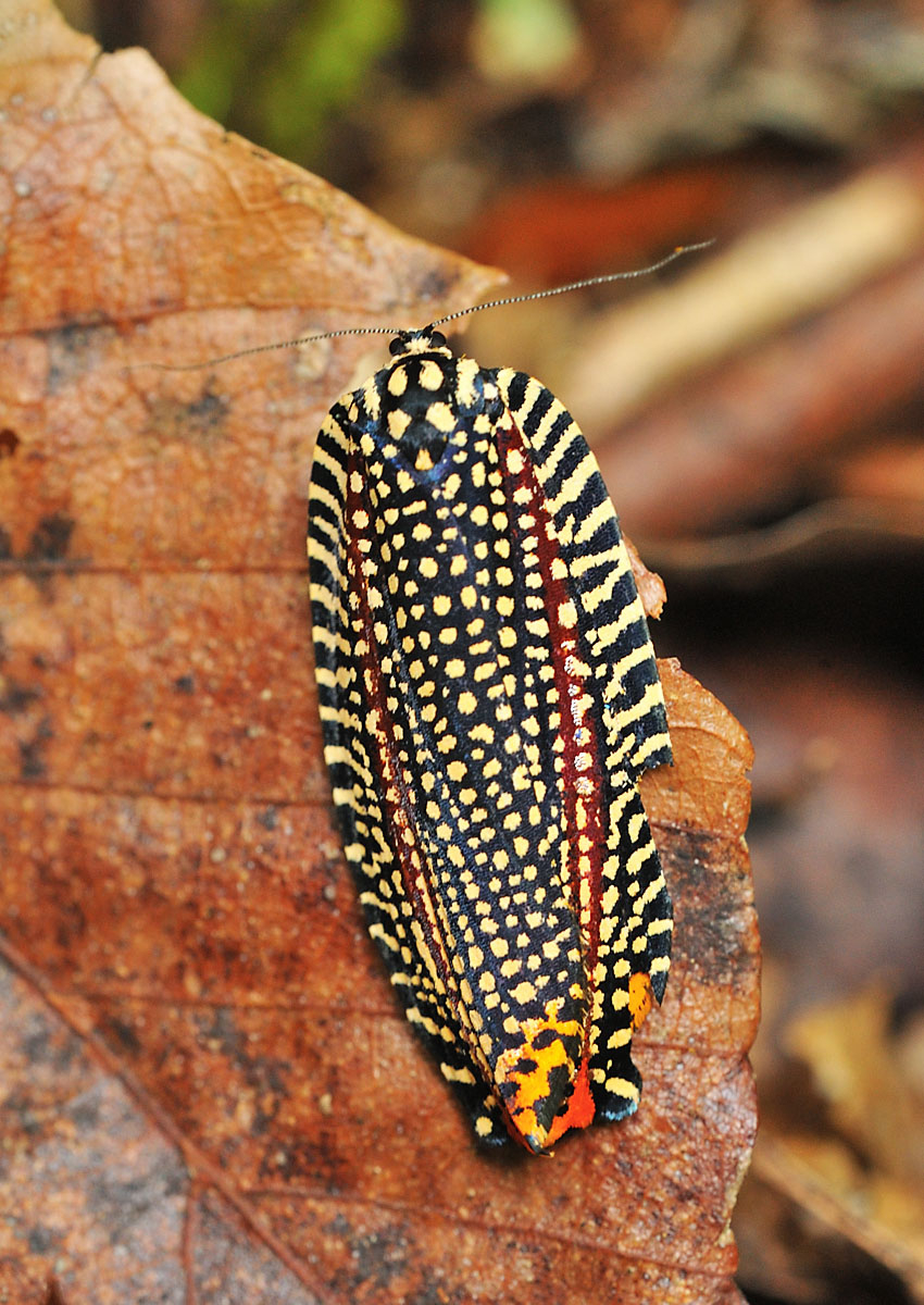 黒色の地に黄色の小さな斑紋の列がたくさん並ぶ、美しい蛾。草間彌生のアートを連想させる。