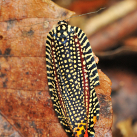 ハマキガの仲間では大型。 黒色の地に黄色の小さな斑紋の列がたくさん並ぶ、美しい蛾。草間彌生のアートを連想させる。