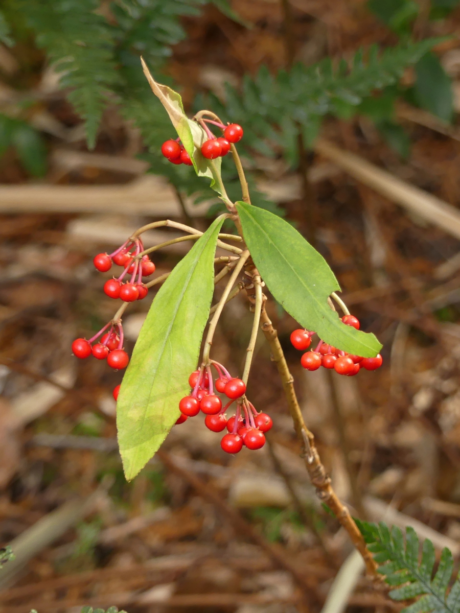 赤またはオレンジ色の実は冬場も残り、よく目立ちます[[マンリョウ]]とは葉のサイズが異なることで識別可能です