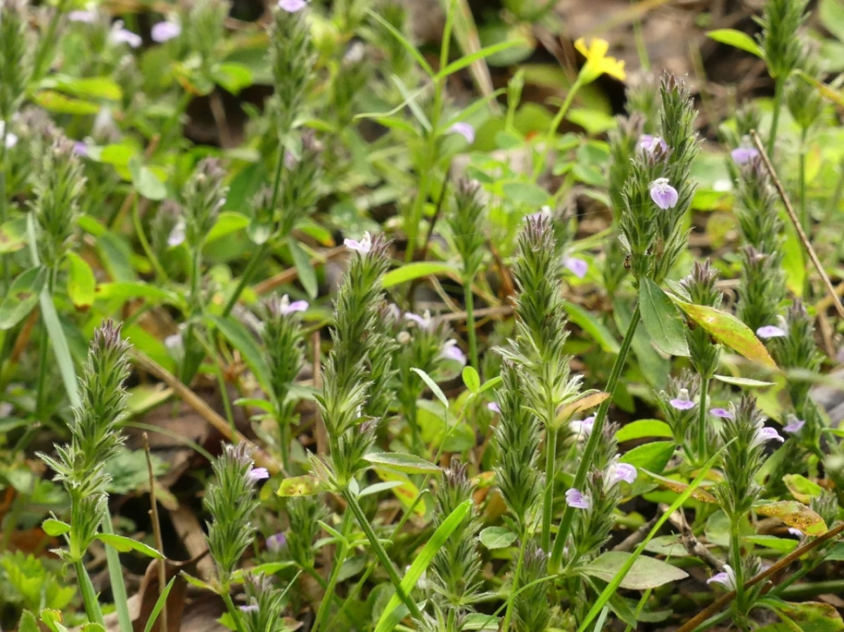里山の林縁や道端に生える一年草。 夏に茎の先端から穂状の花序を出し、たくさんの花を密につけるが、花は一度に咲くことはなく、秋が深まるまでの長い期間、2・3個ずつ咲かせる。 花は唇花型で、上唇と下唇があり、下唇の拡がっている部分だけが赤紫色で、他は白い。