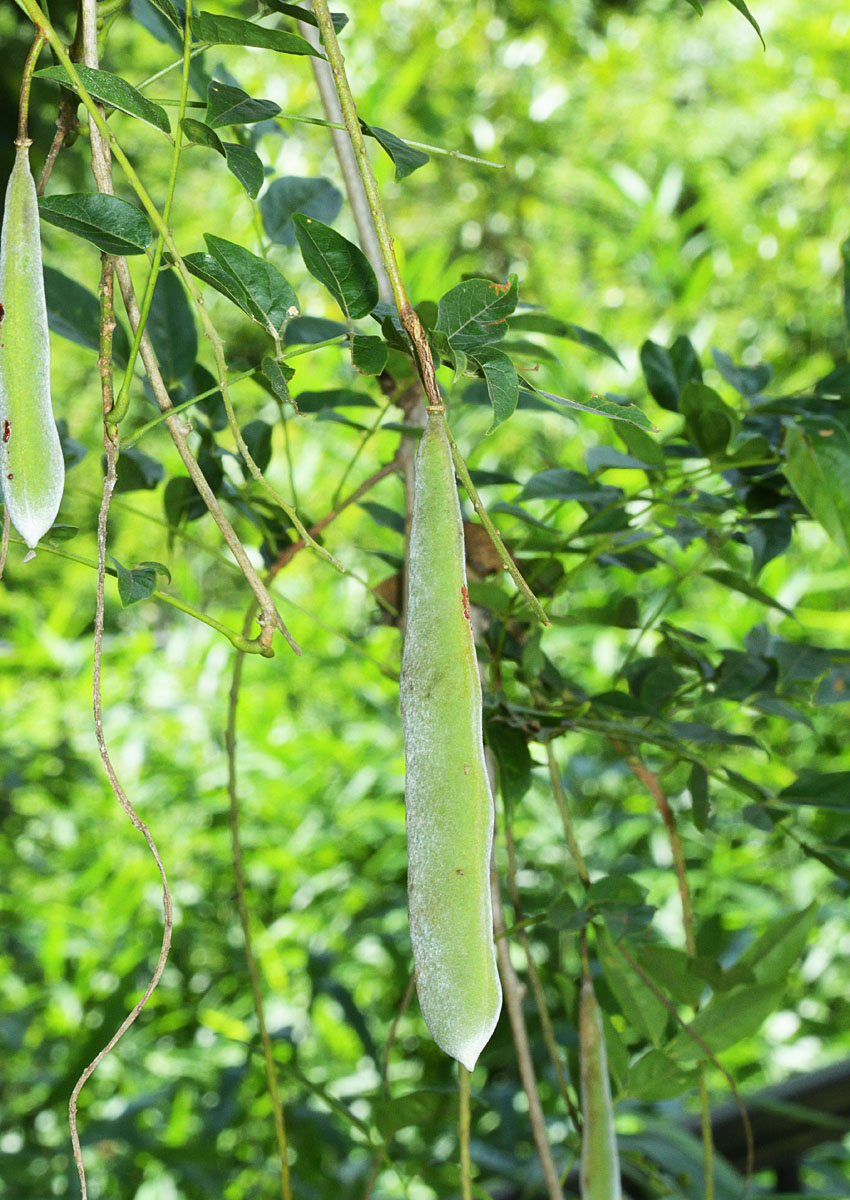 マメ科植物なので豆さやの中に種子である豆が並ぶ。豆は平たい。