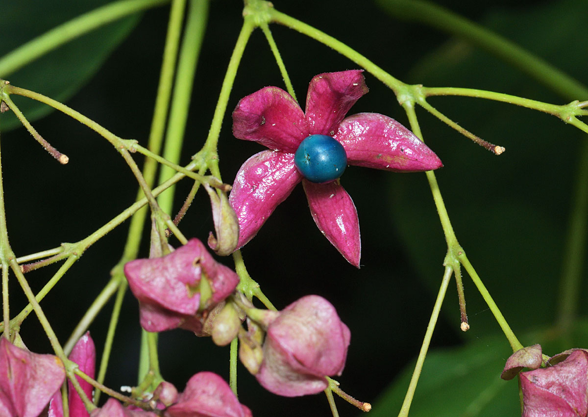 花ではなく実です。赤い花弁のようなものは萼片です。 中央にある青く丸い粒が実です。 撮影地:宝塚市西谷地区