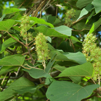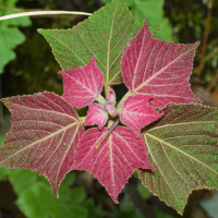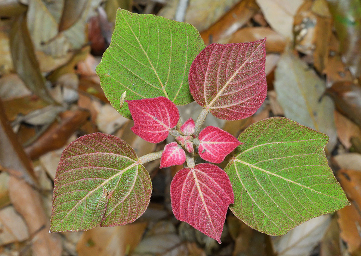 春に出る若葉は、鮮やかな紅色をしていて美しく、星状毛が密生する。葉の基部には蜜腺があり、アリがよく集まっている。アリを呼び寄せることにより、外敵から守ってもらっていると考えられている。