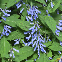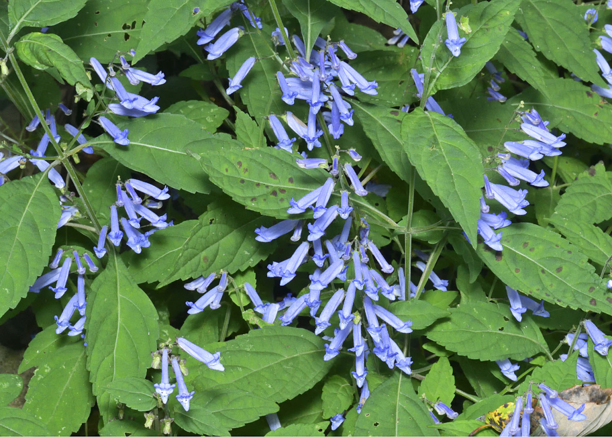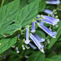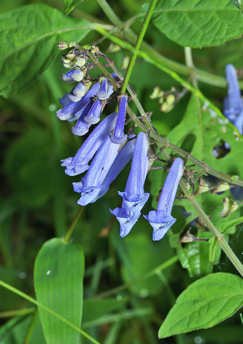 アキチョウジは、秋に細長い筒状の花を咲かせるのが特徴である。花は青紫色で、非常に細長く、下向きに垂れ下がるように咲く。この花の形状は優雅な印象を与える。葉は対生し、細かい毛が散生する。