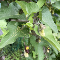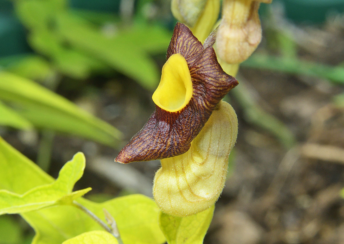 つる性植物で、葉は3裂し、側裂片は丸いものが多い。 花は花弁がなく、外見はサクソフォンのような形をした萼筒のみである。 萼筒の先は三角形で紫褐色、開口部は黄色。