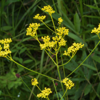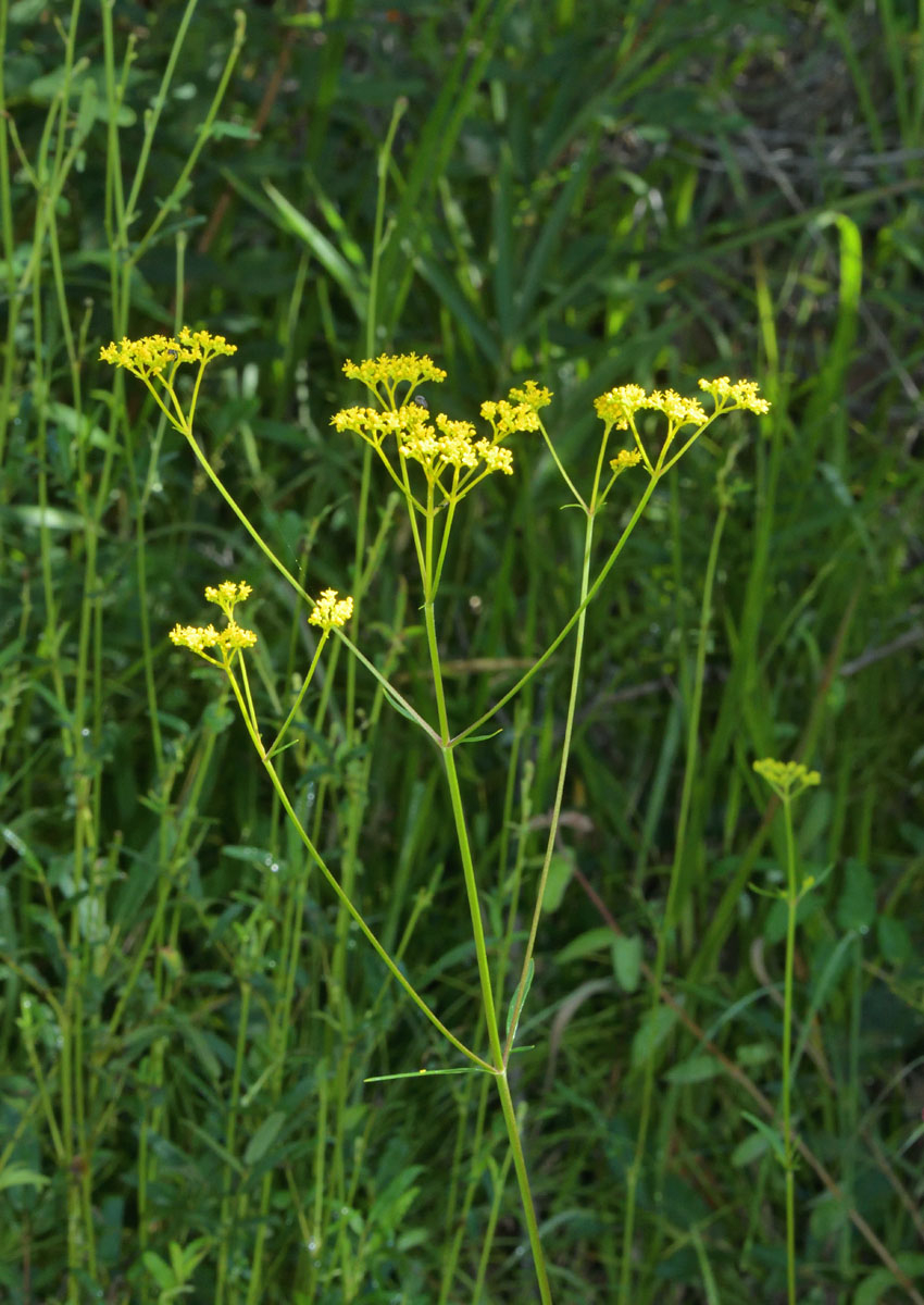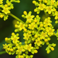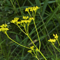 草丈は60~100cm程度で、夏までは根出葉だけを伸ばし、その後花茎を立てる。花茎は上部で分枝して、花茎の先端に黄色い小花を平らな散房状に多数咲かせる。1個ずつの花は、直径3~4mm)ほどの合弁花で、花冠は5裂し、下は短い筒となる。花の中に、雄しべが4個、雌しべは1個ある。