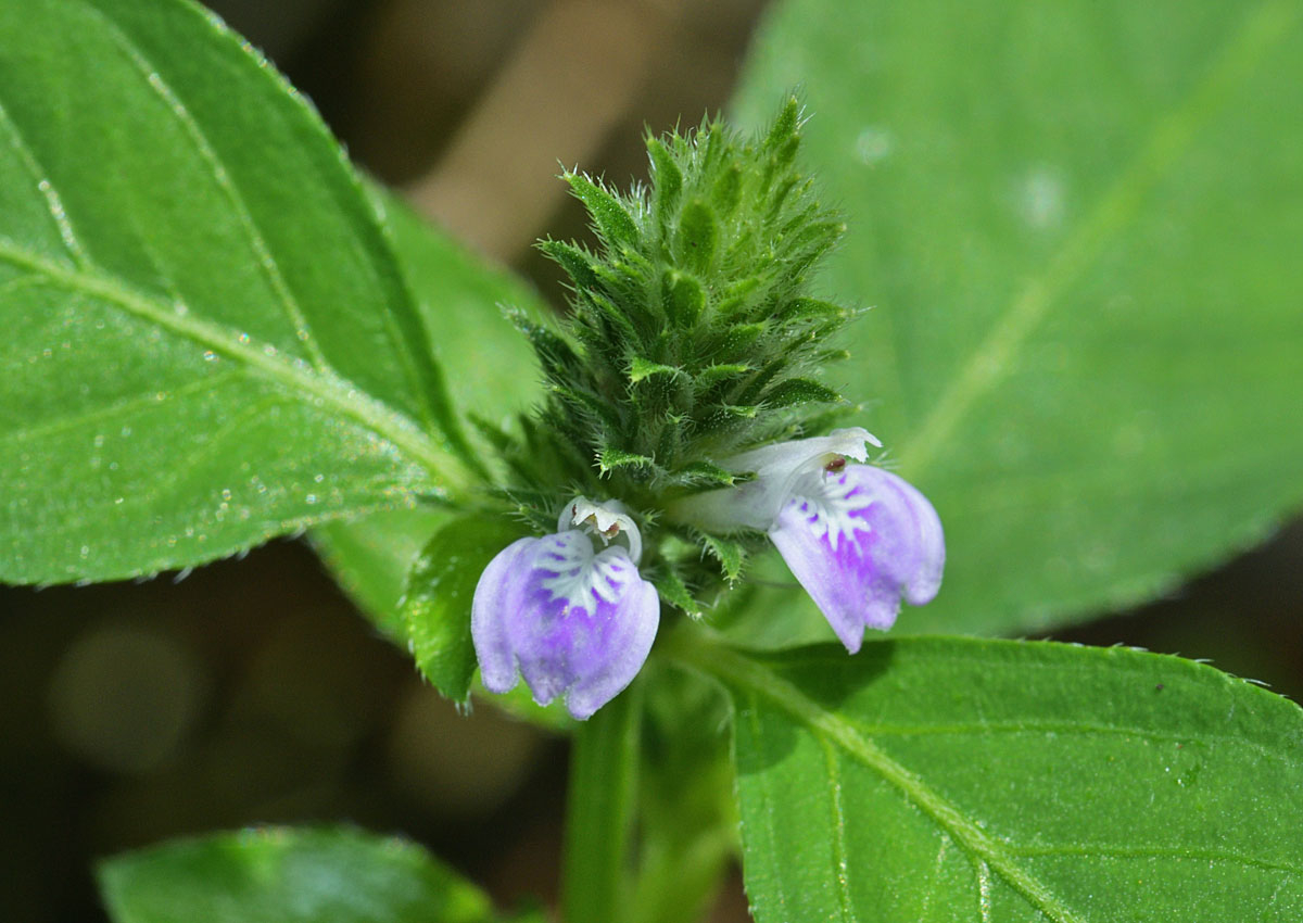 花は唇花型で、上唇と下唇があり、下唇の拡がっている部分だけが赤紫色で、他は白い。