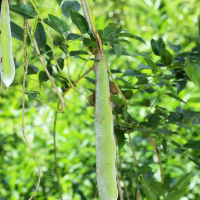 花が終わると大型の豆果が垂れ下がる。豆果(さや)は長さ10~30 cm、幅2~2.5 cmあり、表面にはビロード状の短い毛を密生する。