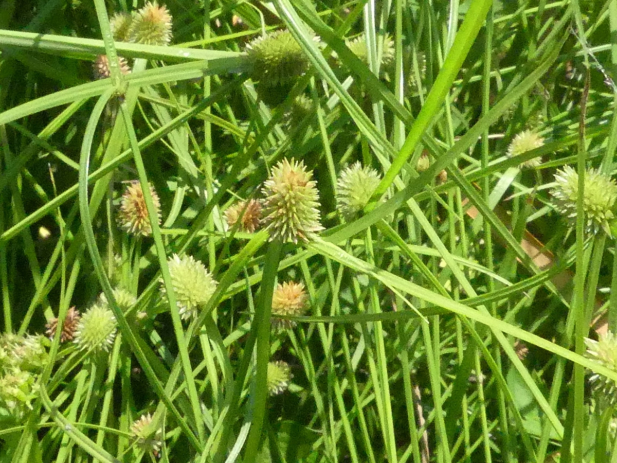 花序は球状、無柄、径5〜12mm、密に多数の小穂をつけ緑色。花穂の下につく苞葉は下向きに反曲してつき、苞葉の葉身は2〜4枚、葉状で長い。