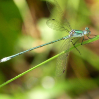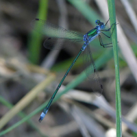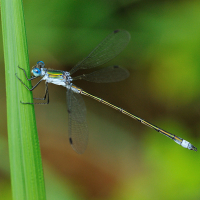 光沢のある青緑色のイトトンボ。オオアオイトトンボと似るが、本種の方がやや小さい。また、本種の成熟したオスは腹部第9節と第10節の2節が白いことや、胸部側面も白い粉を吹くことで見分けられる。