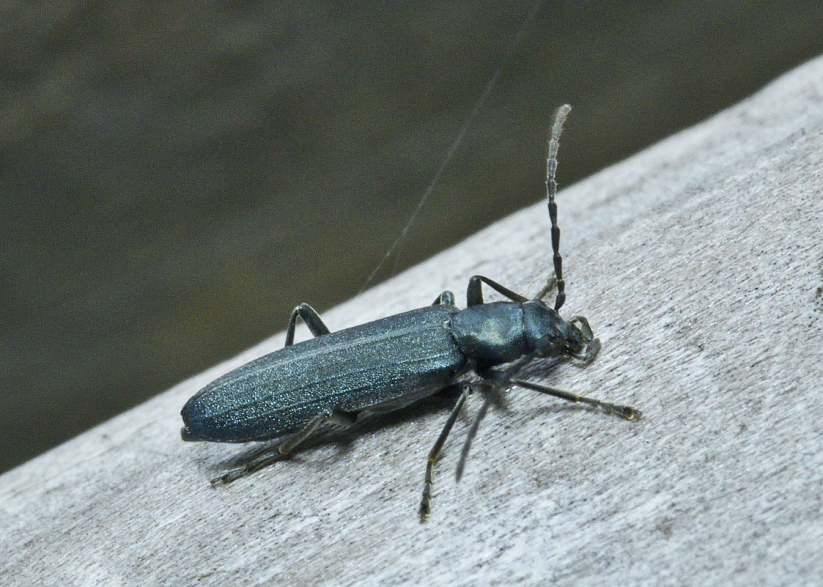 上翅がツヤのない暗青色をしたカミキリモドキ。