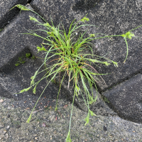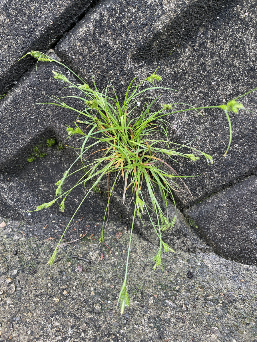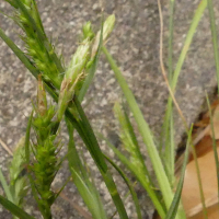 は、やや硬めの葉をもつ種で、雌小穂は株の根元近くに生じ、そこから長く茎を伸ばして先端に雄小穂をつける。