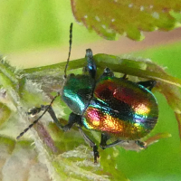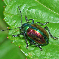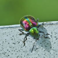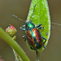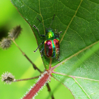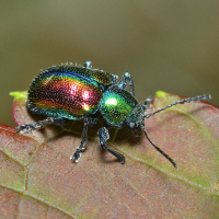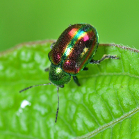 サルハムシ亜科の一種。 上翅は赤色で緑色の縁取りがあり、その他の部分は緑色。 全身に金属光沢があり、きれい。