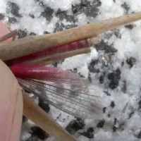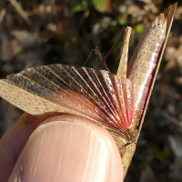 ・翅をたたんだ状態では在来のオンブバッタとほとんど区別がつかないが、後翅が赤~ピンク色を帯びるのが特徴。