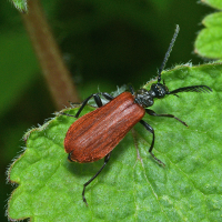 黒い体に赤色の上翅で、有毒のベニボタルに似る。